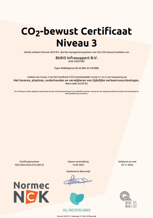 Every day, BUKO Infrasupport’s employees are making an important contribution to the safety of road users and those who work on our roads in the Netherlands. To create a safe situation, we start with safe and environmentally aware working conditions for our own employees, which means neither they nor third parties are exposed unnecessarily to unacceptable risks. This is why we have an active policy and strive for continuous improvement in the area of quality, health and safety, and the environment.