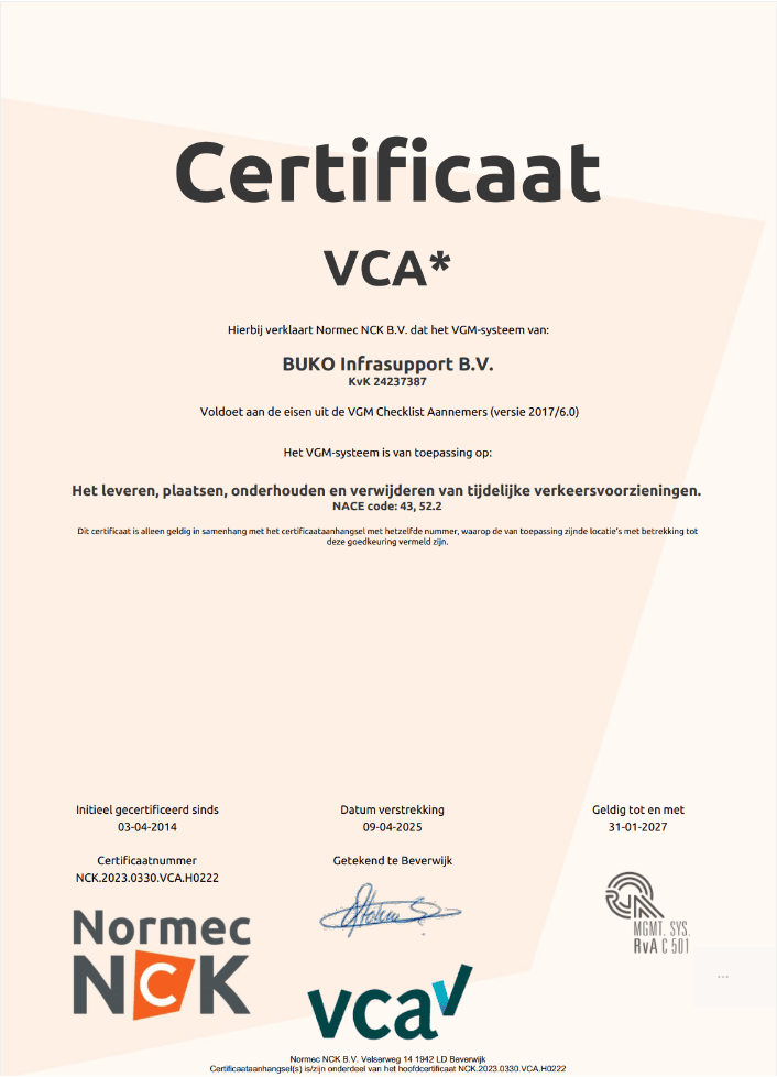 At every level within our organisation, great importance is attached to professional skills and experience. We work in a professional, results oriented way, using our expertise and skills whenever we apply traffic control measures. Our KAM (quality, health & safety, environment) system is certified under: